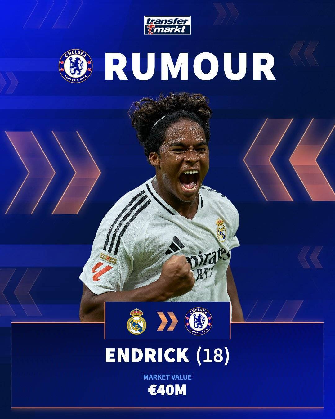 该媒体表示,就在本周,切尔西向皇马求购18岁巴西前锋恩德里克,并给出高达7000万镑的报价。